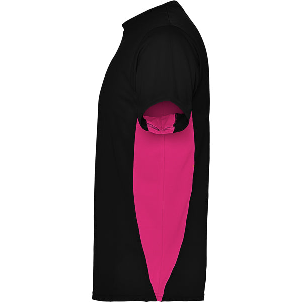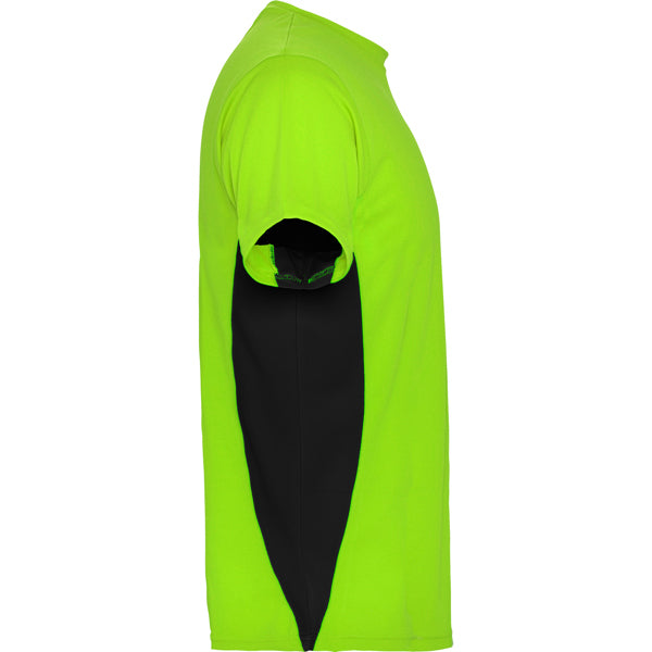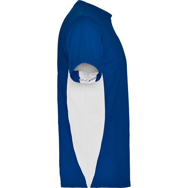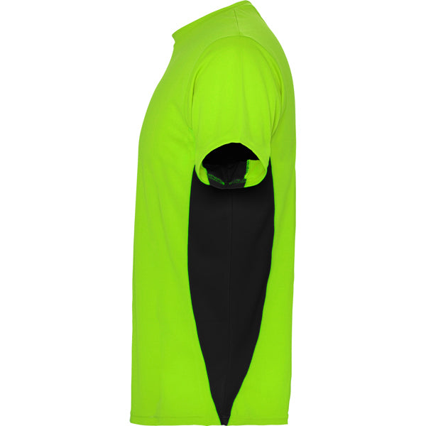 Camiseta técnica de manga corta transpirable. Cuello redondo con cubre costuras a tono. Tejido de fácil secado. Combinación de colores, paneles laterales a contraste.