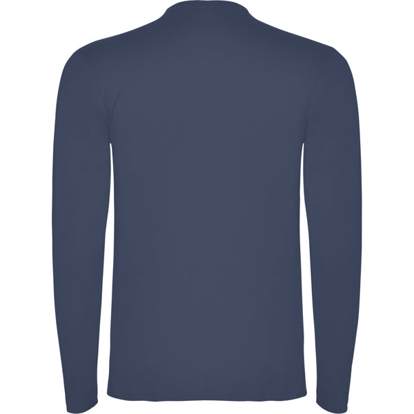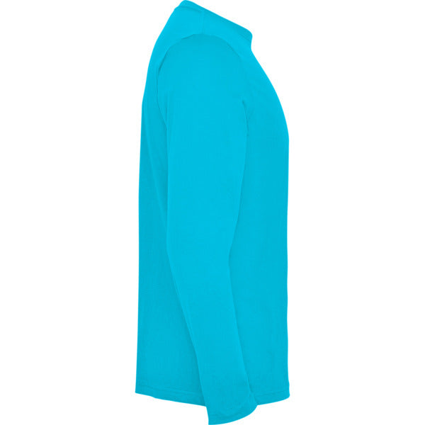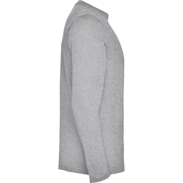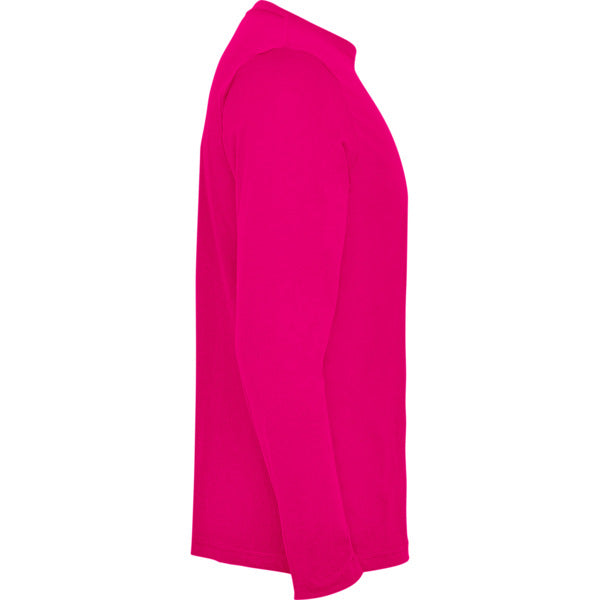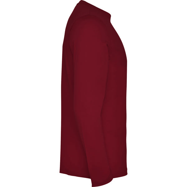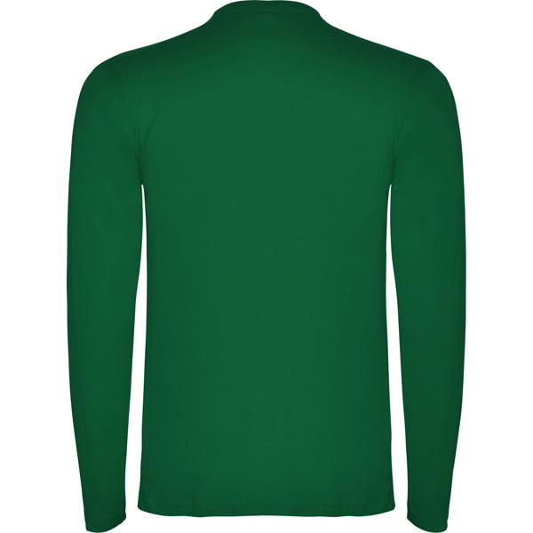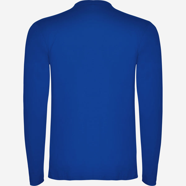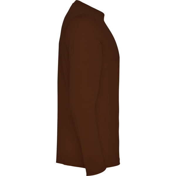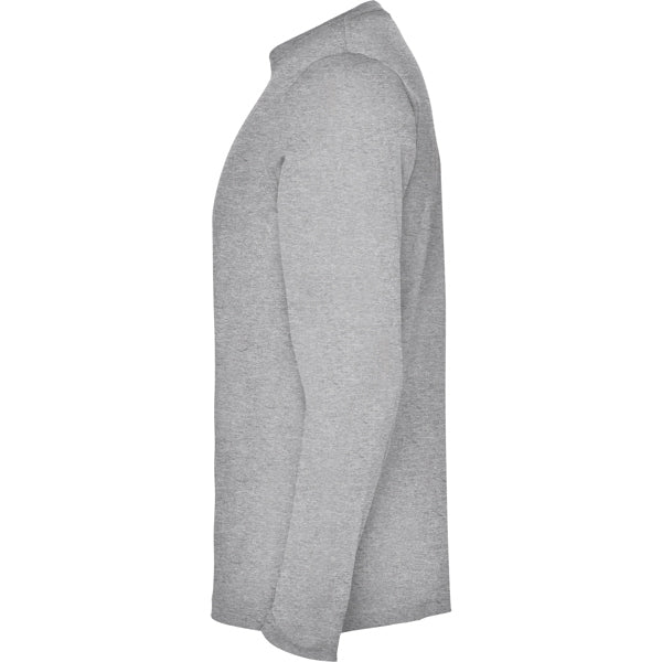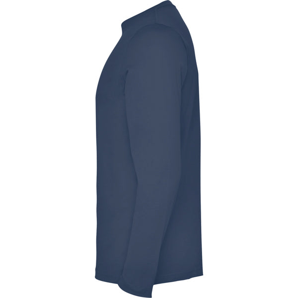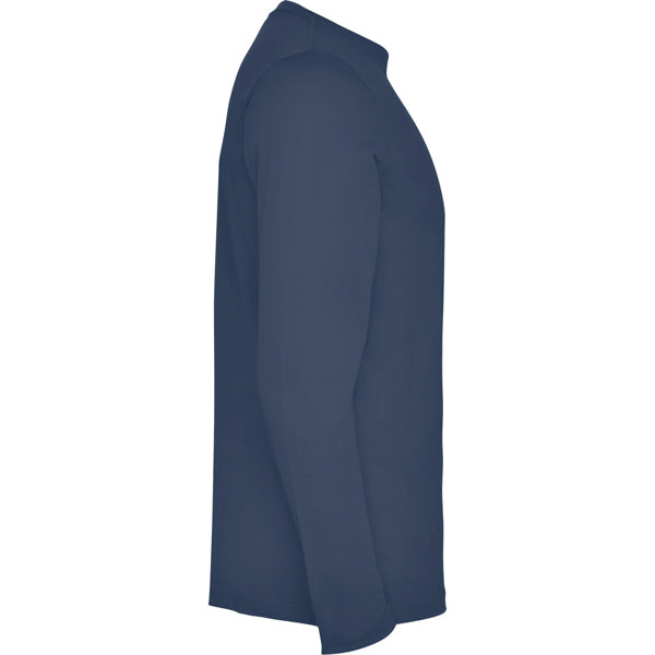 Camiseta de manga larga tubular en tallas de adulto y costuras laterales en tallas de niño. Cuello redondo en canalé 1x1 (4 capas). Cubrecosturas en cuello del mismo tejido.