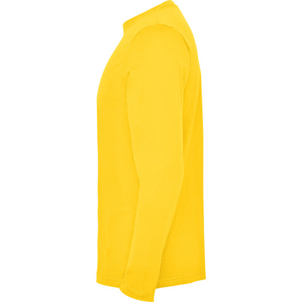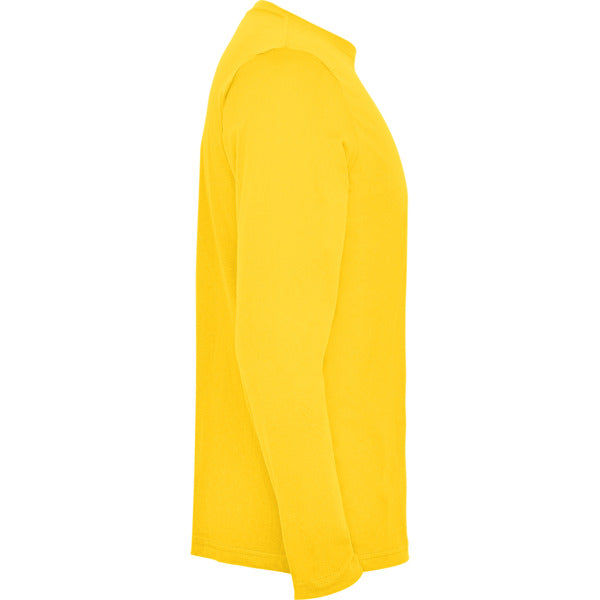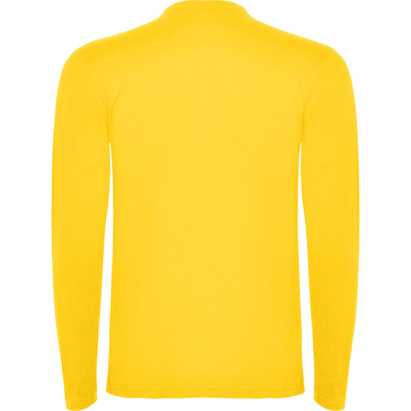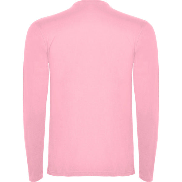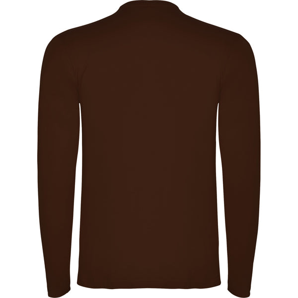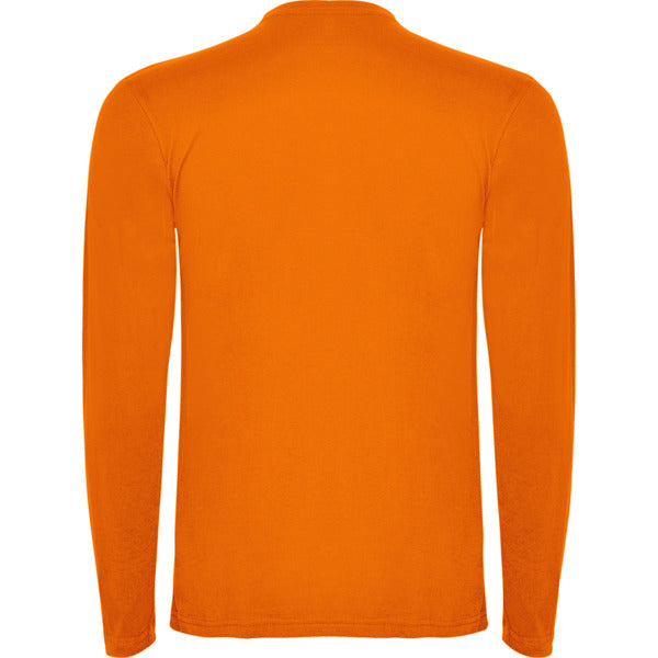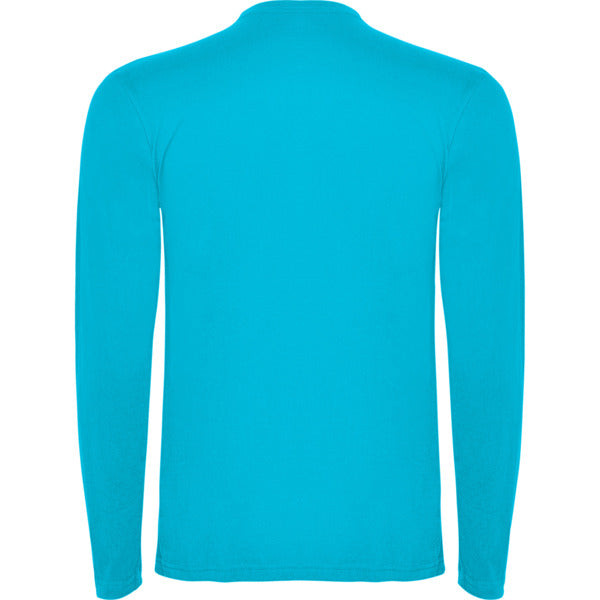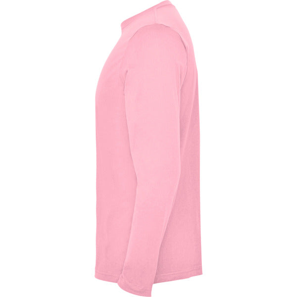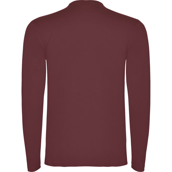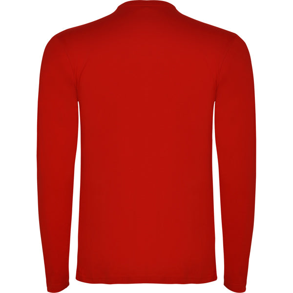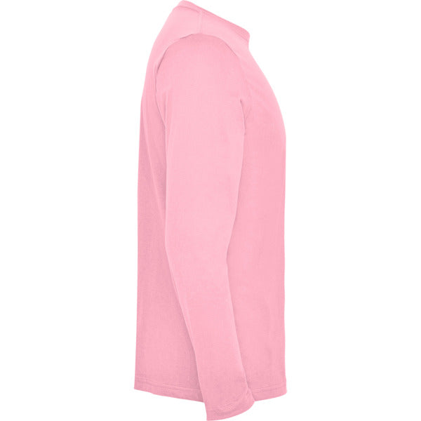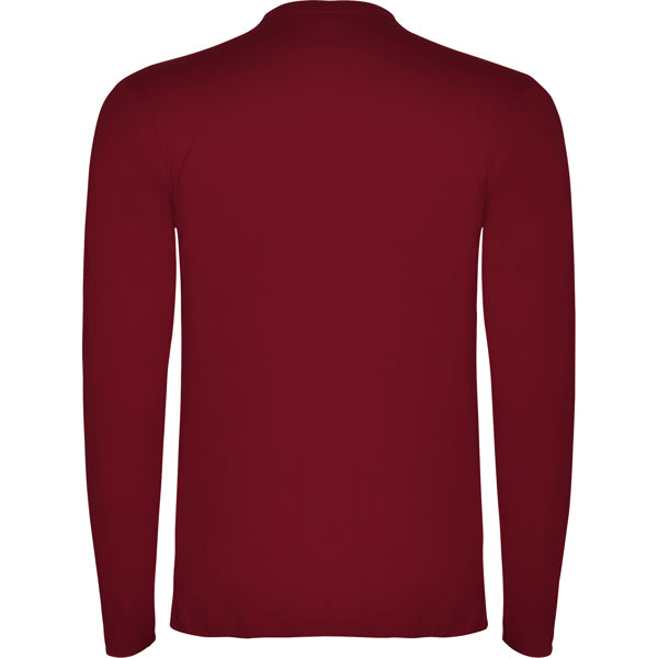 Camiseta de manga larga tubular en tallas de adulto y costuras laterales en tallas de niño. Cuello redondo en canalé 1x1 (4 capas). Cubrecosturas en cuello del mismo tejido.