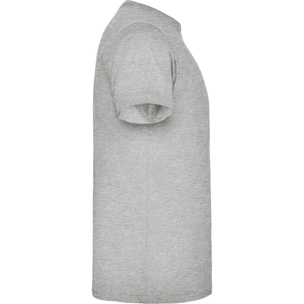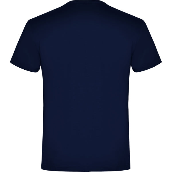 Camiseta de manga corta con costuras laterales. Cuello redondo en canalé 1x1 (4 capas). Cubrecosturas en cuello del mismo tejido. Bolsillo en pecho izquierdo.