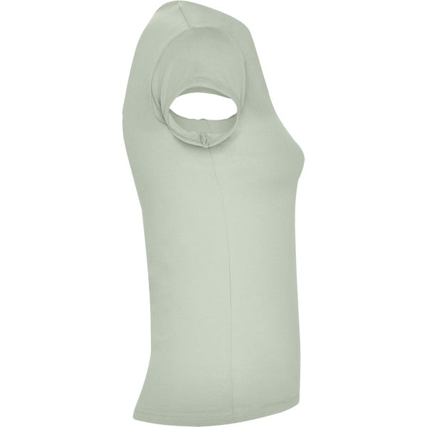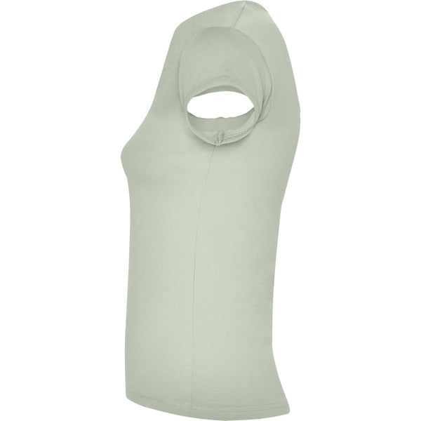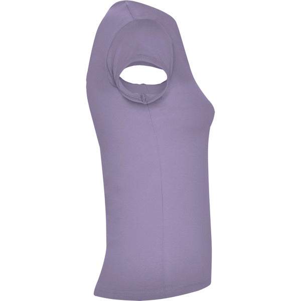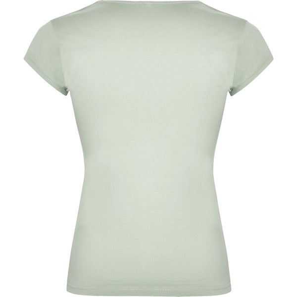 Camiseta de manga corta entallada en cintura. Algodón peinado. Escote entretelado en V. Ribete en mangas del mismo tejido al tono. Cubrecosturas en cuello del mismo tejido.