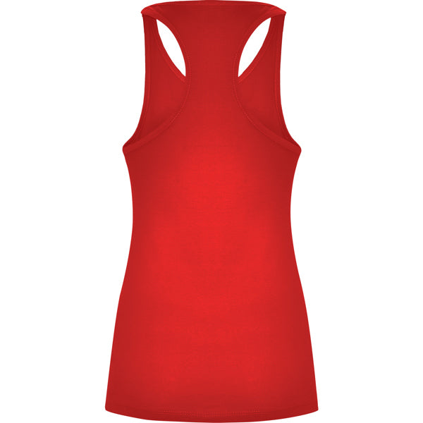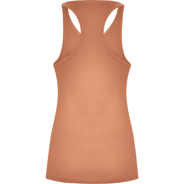 Camiseta de tirantes espalda nadadora entallada en cintura. Cuello con amplio escote redondo y sisas con ribete del mismo tejido.