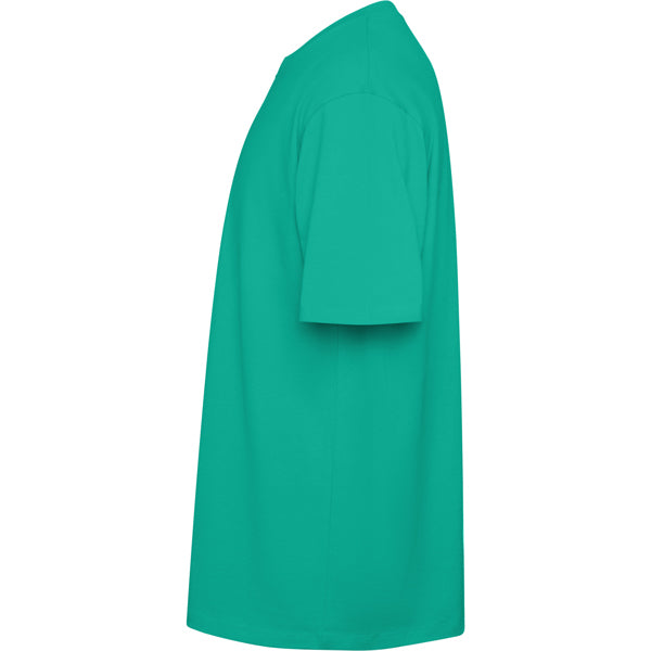 Camiseta gruesa de manga corta oversize. Cuello redondo y puños en canalé 2x1 ancho. Cubrecosturas en cuello del mismo tejido. Doble costura ancha en bajo y mangas. Es una prenda con mucho cuerpo debido a la construcción del tejido.