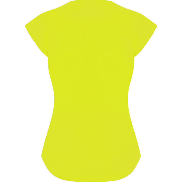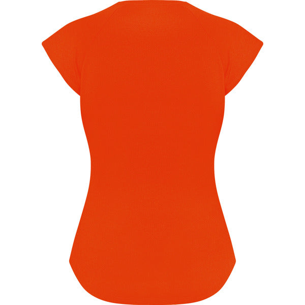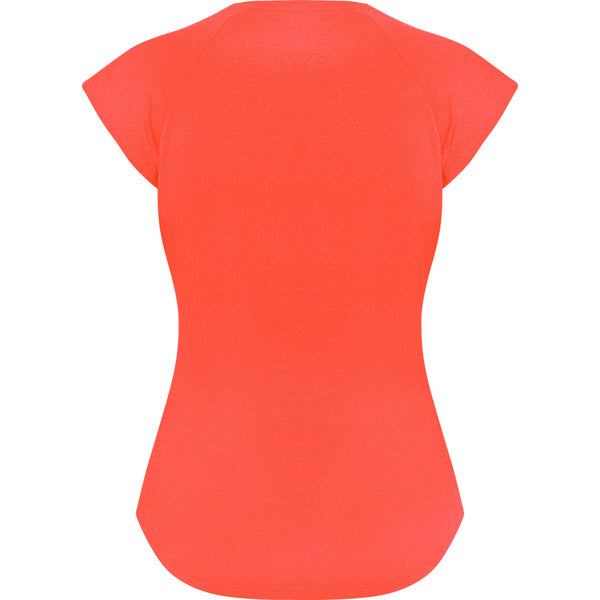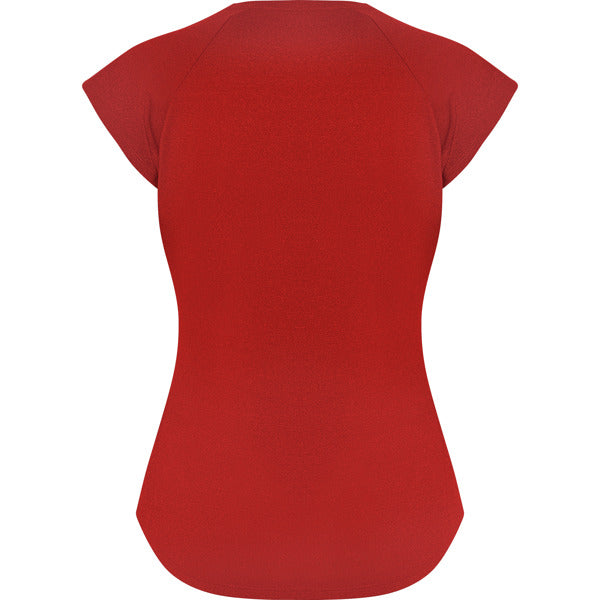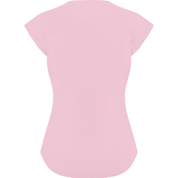 Camiseta técnica manga ranglan ligeramente entallada transpirable y elástica. Acabado piel de melocotón. Cuello en pico y cubrecosturas del mismo tejido al tono. Bajo redondeado.