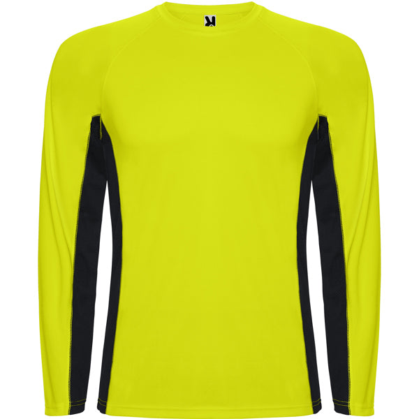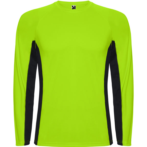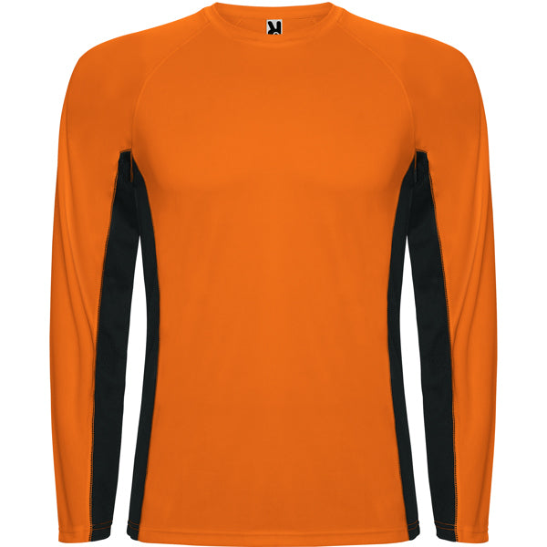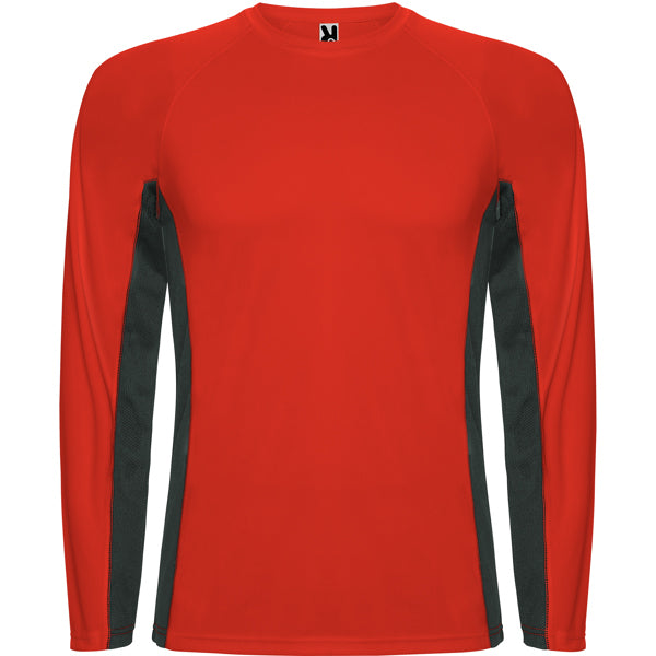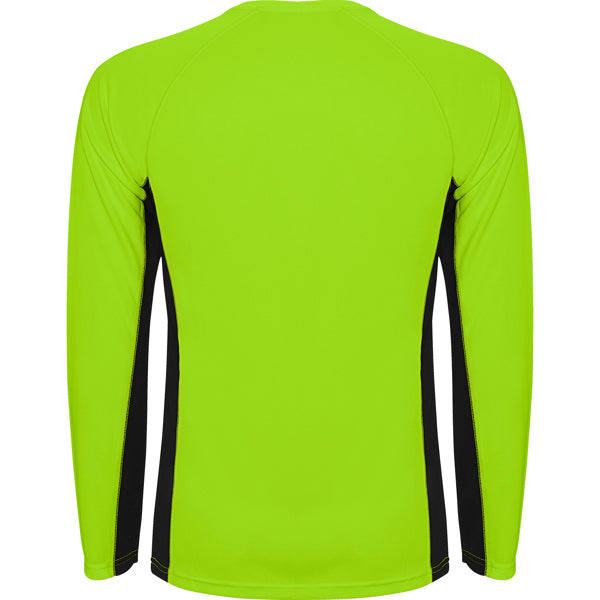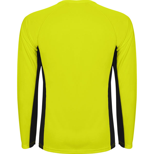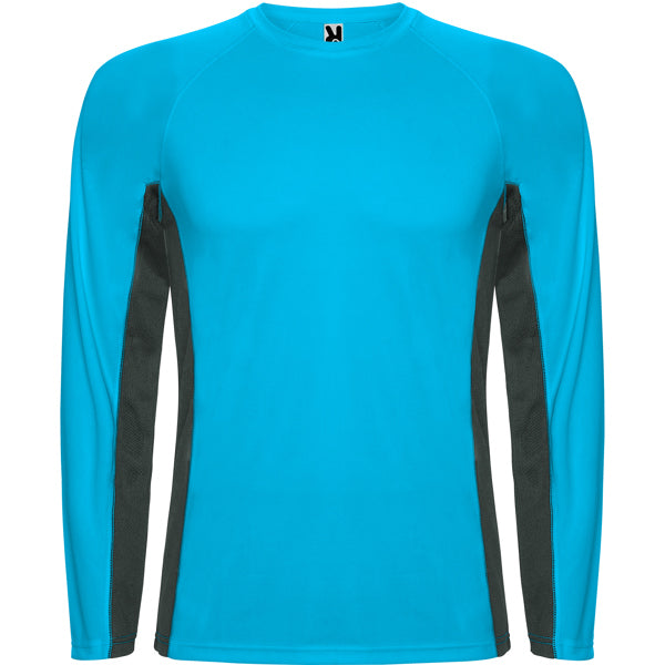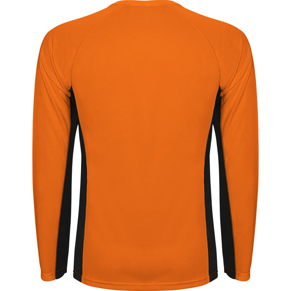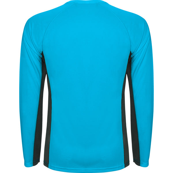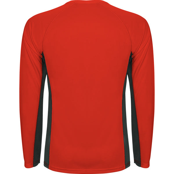Camiseta técnica combinada, con dos tejidos de poliéster. Manga larga de estilo ranglán. Tejido principal bird´s eye y paneles laterales e interior de la manga con tejido micro perforado. Cuello redondo con cubrecosturas de refuerzo en su interior. Camiseta de tejido confortable y fácilmente adaptable al cuerpo.