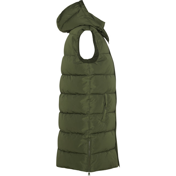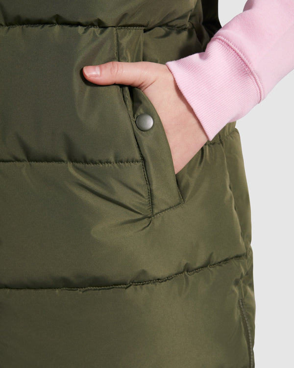 Chaleco acolchado de mujer con capucha extraíble. Cuello alto. Cierre frontal con cremallera oculta por solapa. Dos bolsillos con cierre de botón a presión. Aperturas laterales con cremalleras. Acceso interior en pecho para reprocesos.