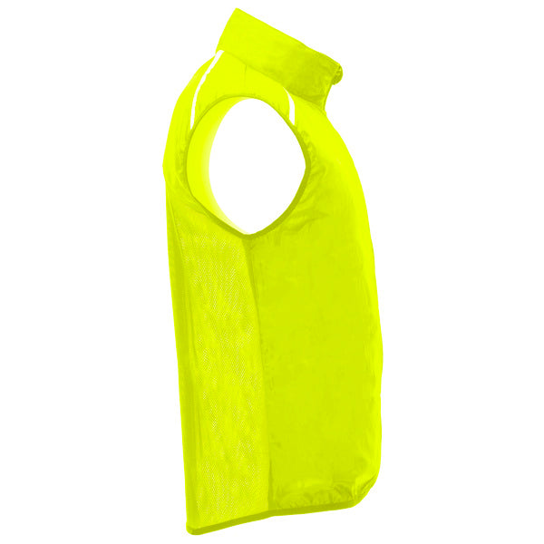Chaleco cortavientos ultraligero. Cremallera frontal al tono. Protector de barbilla. Espalda en tejido de malla transpirable. Bandas reflectantes en el frontal y en espalda de los hombros como puntos de visibilidad aumentada. Sisas y bajo con ribete elástico al tono. Bolsillo lateral izquierdo para plegado.