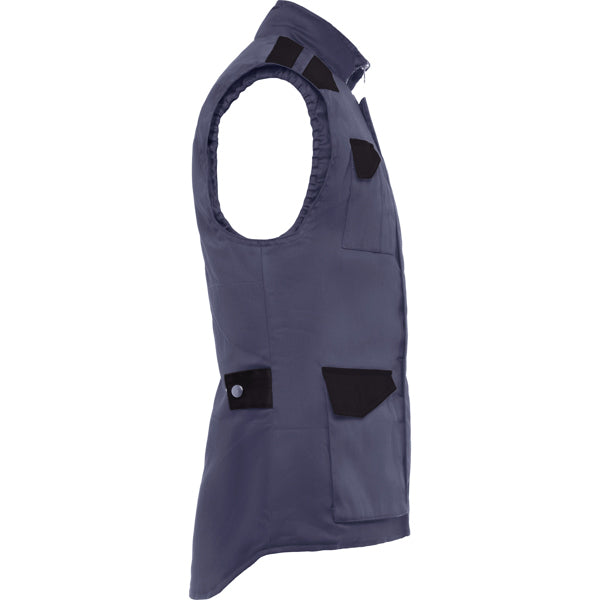 Chaleco laboral multibolsillos acolchado con faldón trasero.· Cremallera frontal con tapeta y cierre de velcros.· Piezas superpuestas a contraste en hombros.· Bolsillo en pecho derecho multiusos.· Dos bolsillos frontales de doble acceso lateral y superior de fuelle con tapeta a contraste.· Bolsillo con cremallera sobre el derecho.· Sisas ajustables con elástico.· Tapetas ajustables en laterales con botones a presión.· Bolsillo interior izquierdo con cierre de velcro.· Etiquetado Roly WRK exterior.