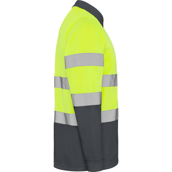 Polo manga larga alta visibilidad. ·Tejido técnico transpirable. ·Dos bandas reflectantes en el cuerpo y dos en mangas. ·Puños y cuello en canalé 1x1. ·Tapeta con 3 botones al tono. ·Bolsillo opcional. ·Cubrecosturas en el cuello. ·Opciones de color en liso y combinado. ·Etiquetado Roly WRK exterior.·Ciclos de lavado: x25