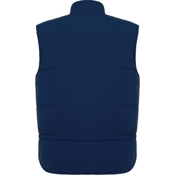 Chaleco alta visibilidad acolchado multibolsillos reversible con faldón trasero. ·Exterior en color azul marino. ·Interior en color amarillo flúor con cintas reflectantes. ·Dos bolsillos frontales de doble acceso, lateral y superior de fuelle con tapeta. ·Bolsillo en pecho multiusos. ·Cremallera frontal con tirador reversible. ·Sisas ajustables con elástico. ·Piezas engomadas en la cintura. ·Faldón en la parte trasera. ·Etiquetado Roly WRK exterior.·Ciclos de lavado: x25