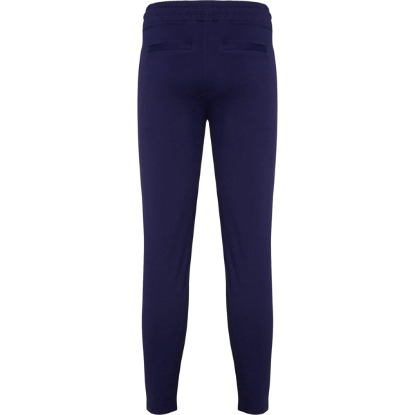 Pantalón en tejido stretch con cintura engomada en la parte trasera y cordón ajustable en la parte delantera con ojales metálicos al tono. Pinzas delanteras. Dos bolsillos laterales. Dos ribetes decorativos en la parte trasera que simulan bolsillos.