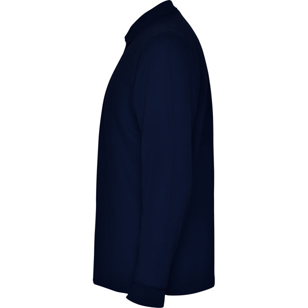 Polo de manga larga. Punto piqué. Cuello y puños tejidos 1x1. Tapeta de 3 botones. Cubrecosturas en cuello del mismo tejido. Aperturas laterales en bajo. Bolsillo opcional.