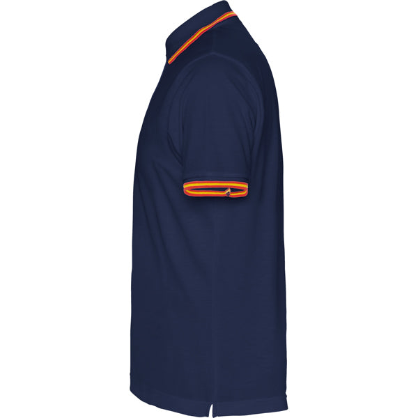 Polo de manga corta con tratamiento antipilling. Punto piqué. Cuello y mangas tejidos 1x1 a contraste de color. Tapeta de 3 botones. Cubrecosturas en cuello del mismo tejido y media luna interior. Detalle bandera bordada en la espalda. Bolsillo opcional. Admite lavado a 60º.